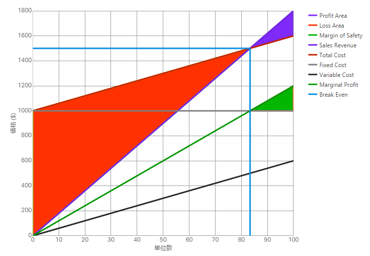 さらに、総費用、損益分岐点、および限界利益 (オプション) のリニア ビューが生成され、利益エリア、損失エリア、および限界エリア (オプション) のエリア ビューが生成されます。