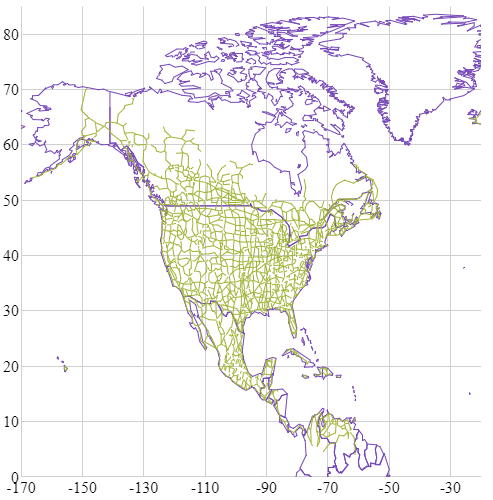 以下のコード例は、igShapeChart を ShapeDataSource のペアにバインドする方法を紹介します。北アメリカのアウトラインおよび主な道路を表示します。