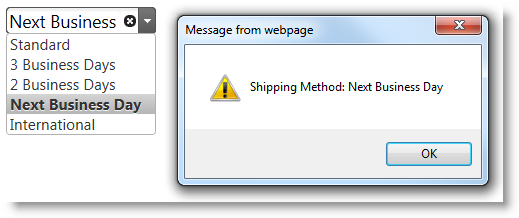 この手順では、ASP.NET MVC ヘルパーを使用してイベント ハンドラーとして JavaScript 関数を構成する方法を説明します。この例では、igCombo の selectionChanged イベントを処理して、選択したテキストを含むメッセージを表示します。