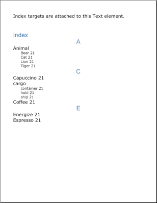 Index 要素は、階層を使用して作成されるという点で TOC 要素に非常に似ています。インデックスが提供する階層の数は、完全にユーザーとレポートの複雑さ次第で決定します。IIndex インターフェイスから AddLevel を呼び出すことによって階層をインデックスに追加します。最も一般的なインデックスは、2 階層で構成されます。この構成によって、複合語句を同じカテゴリにグループ化できます。たとえば、cargo container、cargo hold、cargo ship などの 3 つの複合語を索引に追加する必要があるとします。通常と全く同じように追加して、AddTarget を 3 回呼び出すことによって、各語に個別のターゲット名を提供します。唯一の違いはターゲットのキャプションにあります。コロン(:)を使用することによって、キャプションで索引の階層を分けます。この規則を使用すると、「cargo hold」のキャプションは「cargo:hold」になります。これによって、インデックスで「cargo」という語の下に「hold」という語が配置され、上記のスクリーンショットで示すように 2 番目の階層を使用します。語句をグループ化する方法は、完全にユーザー次第です。