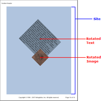 以下のコードは、Site 要素を Section 要素に追加し、次に Text 要素と Image 要素を Site 要素に追加します。上記の画像のように、Text 要素は 45 度回転され、Image 要素は -45 度回転されます。このトピックは、Report が定義済みで、Section 要素が追加されていることを前提としています。