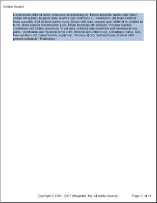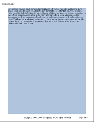 Stretcher 要素は、ページの終わりまでコンテンツを引き伸ばすことのみを目的とした非表示のレイアウト要素です。通常レイアウト要素は、その要素がカプセル化するコンテンツを収めるためにサイズを変更します。レイアウト要素に背景色または画像を含む場合、これは好ましくない効果となる場合があります。レイアウト要素から AddStretcher メソッドを呼び出すと、コンテンツがページの終わりまでなくても、その要素がページの終わりまで引き伸ばされます。以下の 2 つの画像は、背景色を LightSteelBlue に設定された要素が Stretcher 要素がある場合とない場合でどのように見えるのかを示しています。