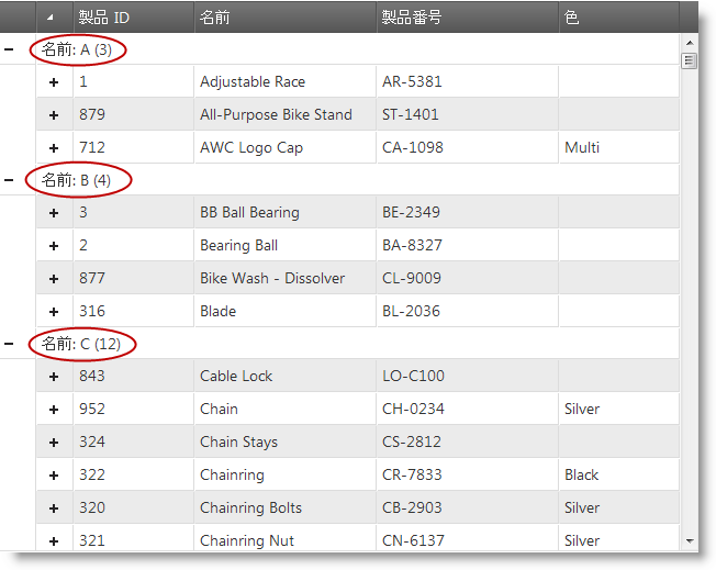上記の JavaScript の例と同様、ここでグリッド ラッパーのメソッド呼び出し GroupByComparerFunction("firstLetterGroupComparer") は、 Name 列のグループ化に firstLetterGroupComparer() 関数を使用するようグリッドを構成します。