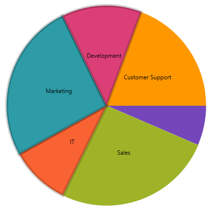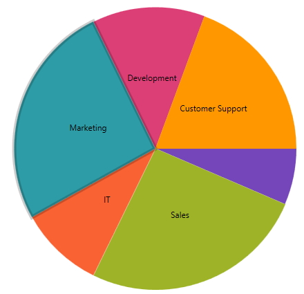 デフォルトで、円チャートはマウス クリックによるスライス選択をサポートします。選択されたスライスは、'selectedItem' プロパティで取得します。以下の画像にあるように、選択されたスライスは強調表示されます。