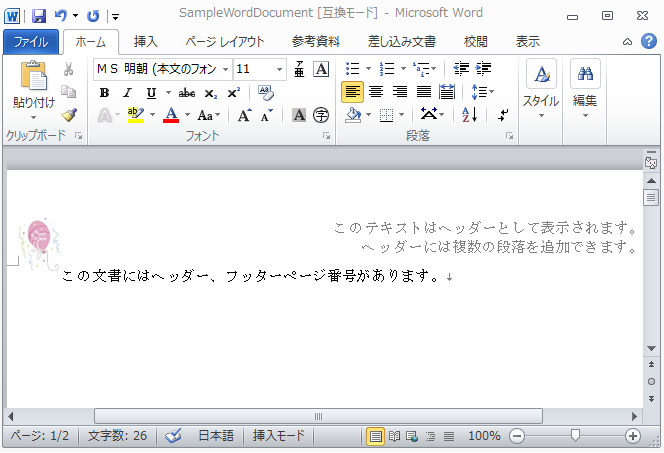 以下のスクリーンショットは、Header にテキストと画像を付けて作成された Word 文書を表示します。