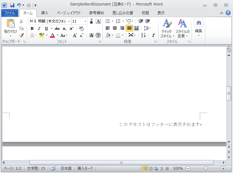 以下のスクリーンショットは、Footer にテキストとページ番号を付けて作成された Word 文書を表示します。