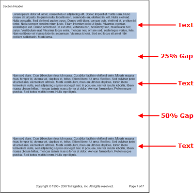 Gap 要素の相対的な高さを使用するには、Height プロパティを RelativeHeight クラスのインスタンスに設定する必要があります。これによって、使用可能な残りスペースのパーセンテージでギャップの高さを指定できます。そのため、ページの最後に追加された Gap 要素と同じ値を持つページの最初に追加された Gap 要素は、より大きなギャップになります。これは、最初の Gap 要素はその後に残されるページの量が多いためにパーセントで指定すると数字が大きくなってしまうからです。右の画像を参照すると、この概念をよく理解できます。最初の Gap 要素は、追加された時点のページの 25% を使用しています。2 番目の Gap 要素は追加された時点のページの 50% を使用していますが、最初の Gap 要素とほぼ同じサイズになっています。